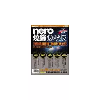 打造燒不死環境:燒錄器和光碟選購檢測;打造Nero燒不死的燒錄環境;燒壞的CD、DVD大復活;共享網路燒錄器資料備份燒錄必殺技:資料燒錄;將可複寫光碟變成大容量磁碟片;多重區段燒錄;備份特定檔案及資料夾;燒錄備份光碟;還原我的重要資料;讓備份動作全自動完成活用光碟映像檔:製作光碟映像檔;燒錄映像檔的進階設定;將映像檔燒在光碟上;用虛擬光碟機開啟映像檔製作救援光碟必殺技:燒一張開機光碟;把Nero當Ghost用;製作一張Windows XP SP2完整光碟相片影音燒錄必殺技:製作VCD相片光碟;用CD-R來備份一部DVD影片;一季影集轉燒DVD全攻略;DVD影片防拷解禁、瘦身燒錄一氣呵成;DVD影片對拷術;DVD轉檔、燒錄的最佳利器音樂製作必殺技:音樂分軌燒錄一氣呵成;將MP3轉換成音樂CD;多音軌音效編製及混音;製作無人聲純伴奏音樂;將音樂CD轉成高品質MP3;把MP3音樂轉成MPEG-4;打造無失真音樂密技大公開;聽、轉、燒多媒體檔案的好幫手Nero外掛總動員:自製RealMedia串流音樂檔;自製美聲MP3音樂檔;將5.1聲道轉為2聲道;不放空白片也能調整燒錄速度;不用系統管理員也能使用